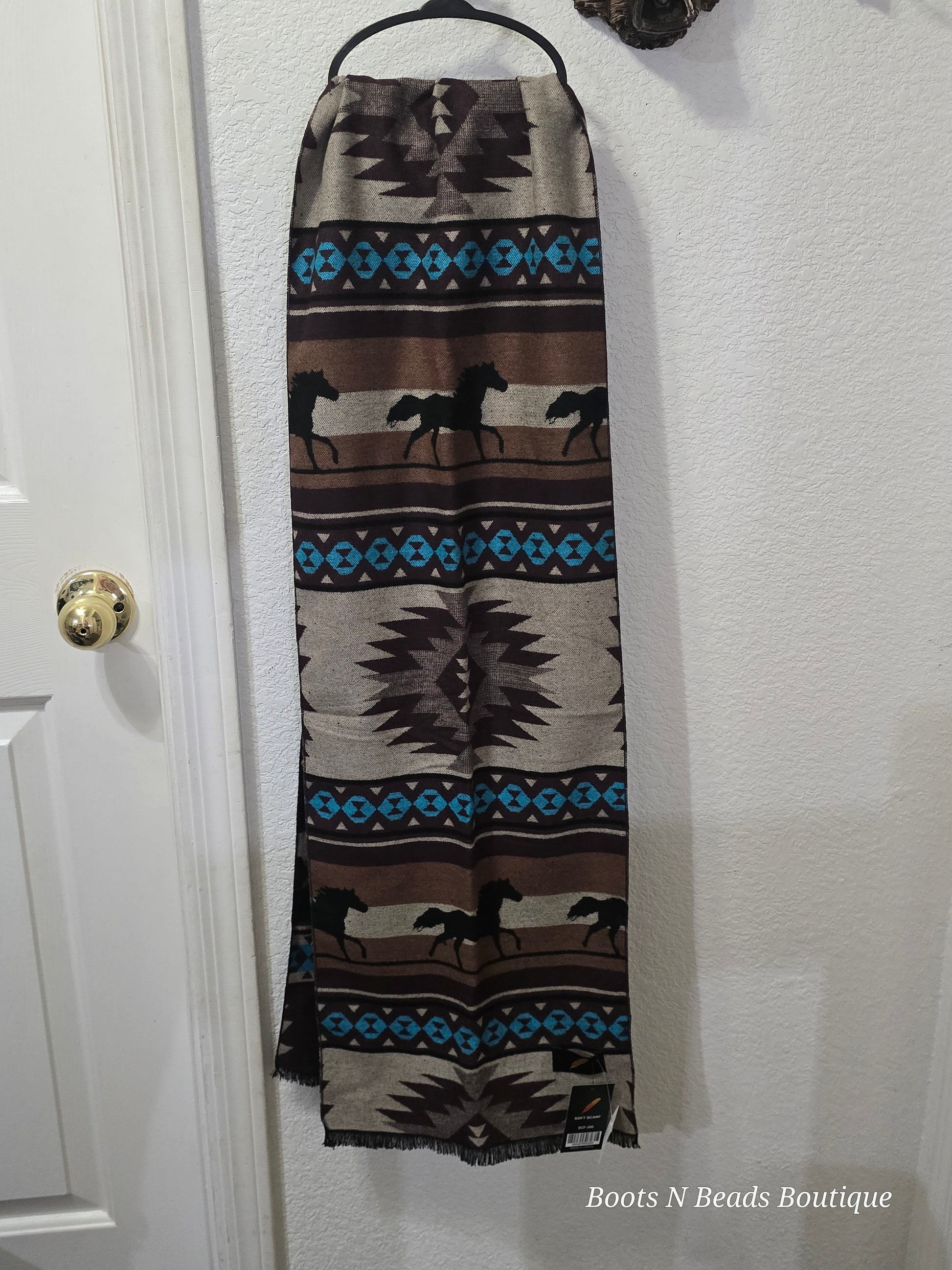 A super soft, lightweight scarf with a horse Aztec design—easy to wear and easy to love.
